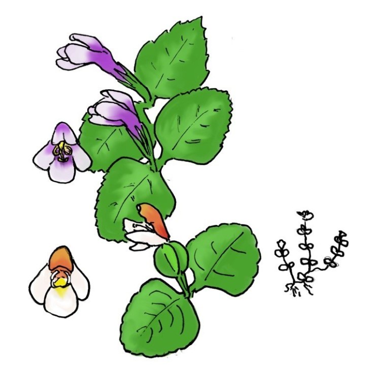 Lindernias are purple with pointed leaves that are arranged in opposite pairs. Malayan eyebrights are white and red with four green āwingsā at the base of the flower. Eyebrights have rounded leaves.